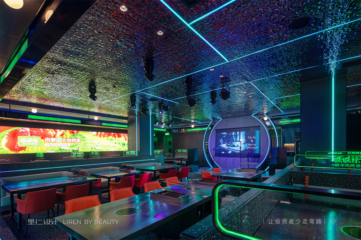 整个店都是清爽的绿色主色调,再搭配简约高级的灰色背景和白色灯光点缀。店内大面积应用的霓虹灯与不锈钢冷调,动态显示屏插播着个性潮流标语,科技感十足,视觉冲击力震撼。无论在店里任何角落,随手一拍就是大片,吃烤串,发朋友圈,瞬间让你变身朋友圈时尚达人。